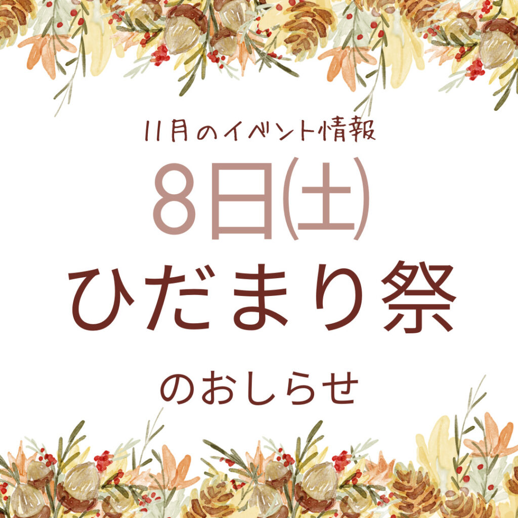 今年度も11月8日土曜日に「ひだまり祭」を開催いたします。たくさんのお店やワークショップの出店もありますので、皆様、お誘いあわせの上お越しくださいませ!!