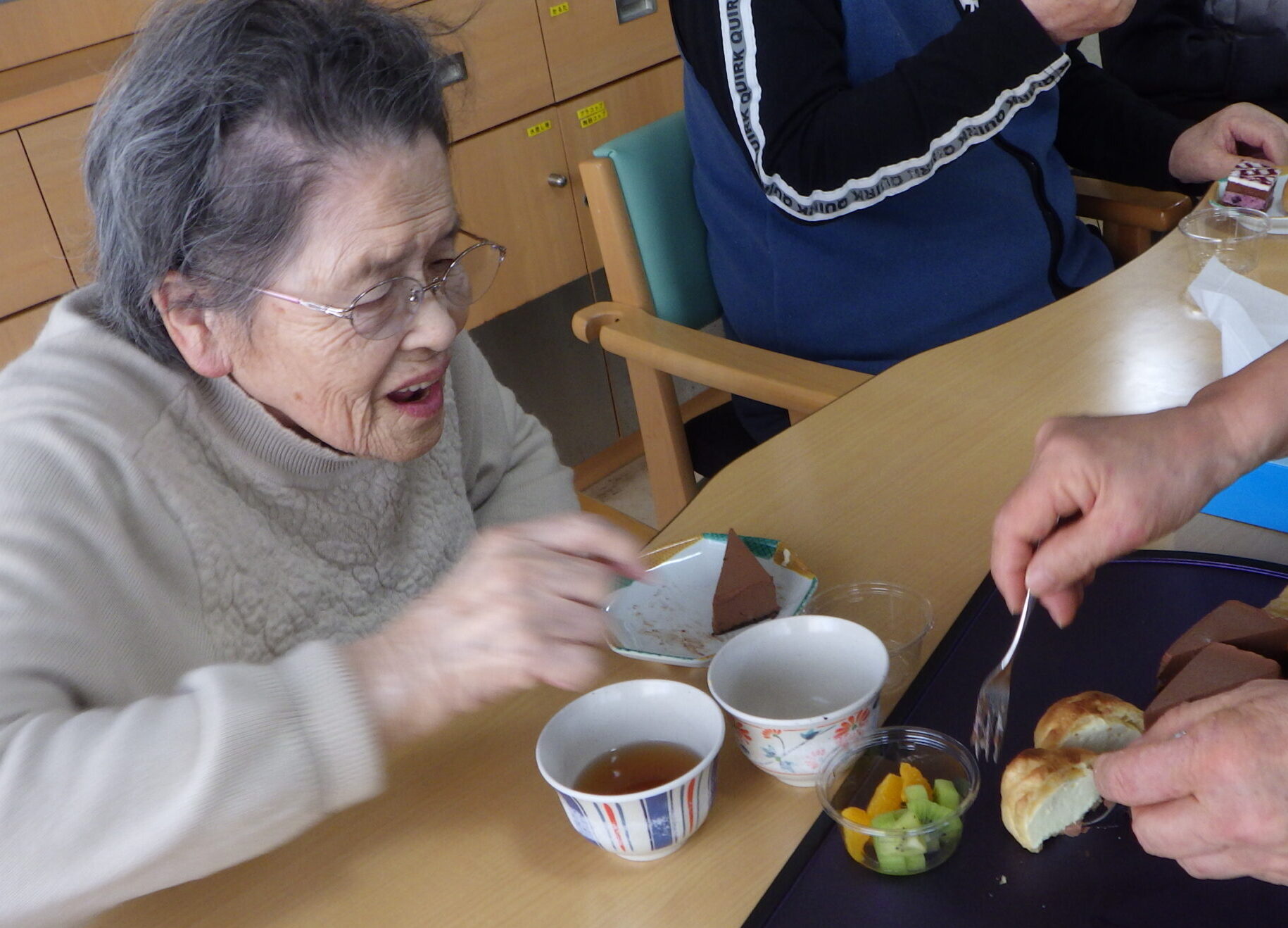 おやつバイキング(ショートステイ)2月5日(木)ショートステイたんぽぽでは、久しぶりの「おやつバイキング」を開催。たくさんのおやつが並び…どれにしようか迷いますね1番人気は・・・なんとシュークリーム♪続いてショコラムースケーキとフルーツでした♪程よい甘さで美味しく、夕食が食べれるかどうか心配になるほど、おかわりの方もたくさんおられました★